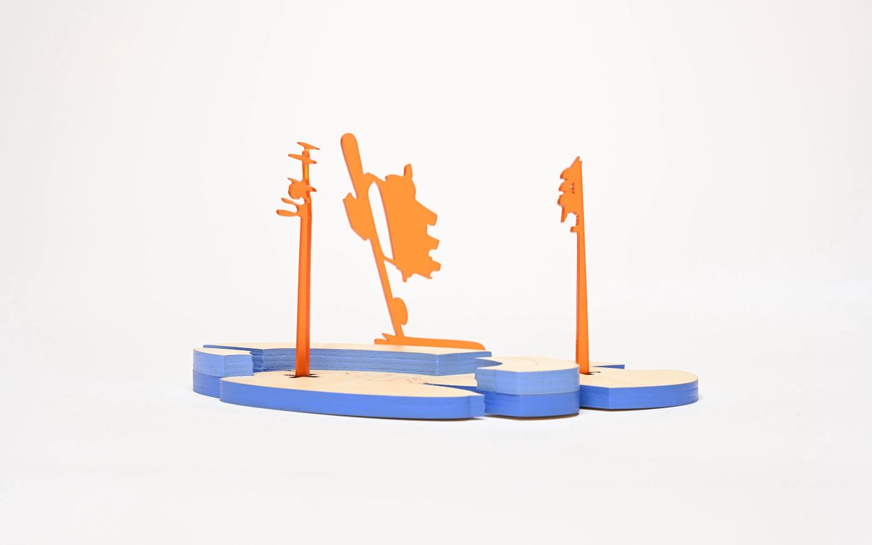 Claire Undy's multiple is a double-sided work on paper, which can be opened and stood in a variety of configurations. It shows the artist stretching and becoming contorted, juggling everyday life. The image cannot be laid flat, except when it is folded down into its smallest configuration as a square.